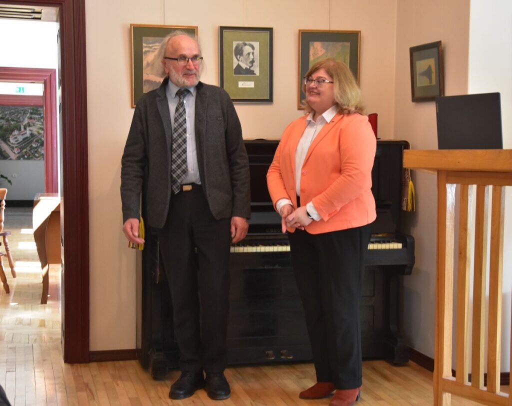 V. Rutkauskui antrino ir viešnia. Dr. R. Šmigelskytė-Stukienė džiaugėsi, kad klasicizmas neaplenkė ir Rietavo. Jos paskaitos metu žvilgsnis buvo kreipiamas į pačią epochą ir kunigaikščius Oginskius bei jų paveldą Lietuvoje.