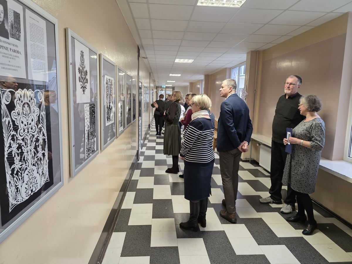Po iškilmingo fotografijos išnešimo, šventinis susitikimas persikėlė į mokyklos vidų, į vieną iš koridorių, kur eksponuojama O. Stonkuvienės karpinių paroda. Kaip gimė mintis surengti šią parodą, papasakojo dailės mokytoja Lina Bulavienė.