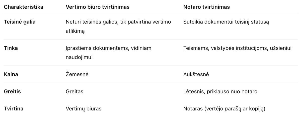 Svarbu žinoti, kad notaras netikrina vertimo turinio — tai atlikęs vertėjas prisiima atsakomybę. Notaras tik patvirtina, kad dokumentą pasirašė konkretus specialistas.